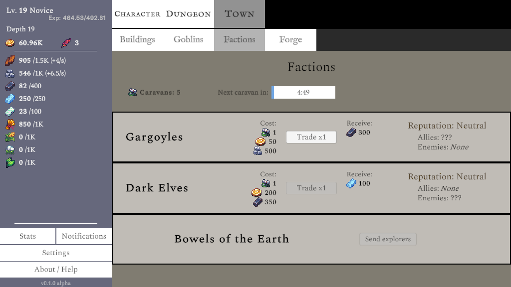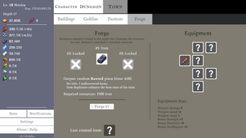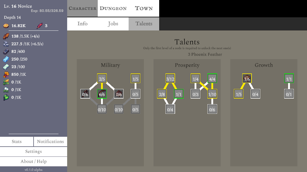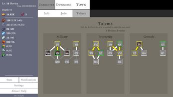 Grow stronger through jobs, talents, rebirths (unlocking new jobs/talents), town building, faction trading, and forging equipment.